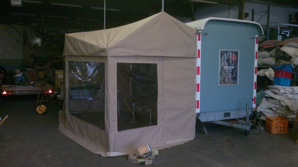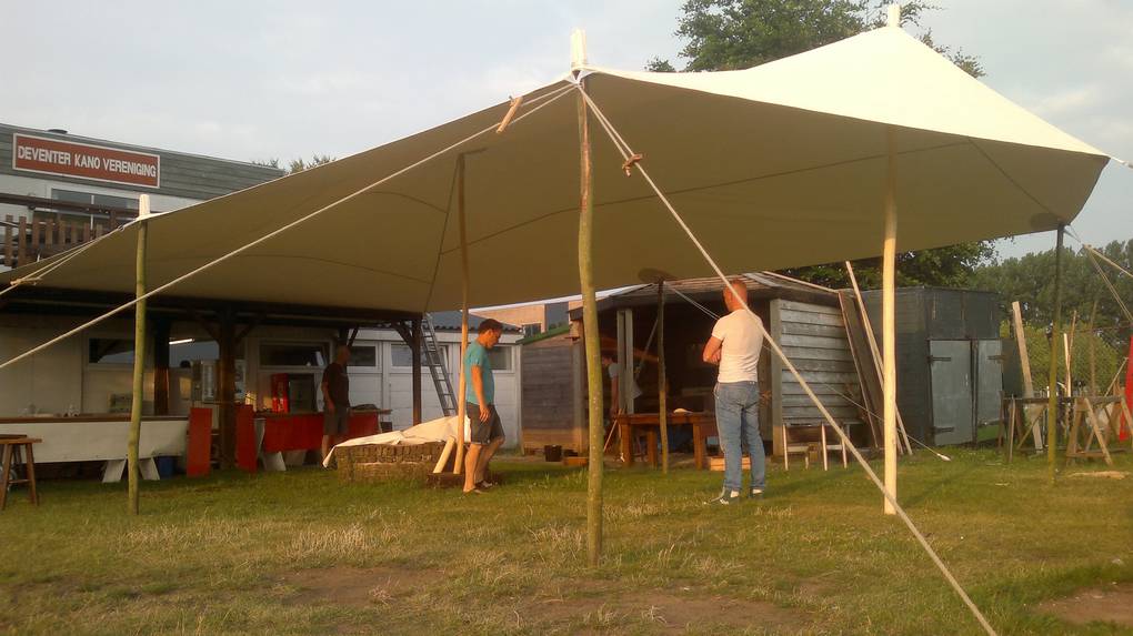 Ook het canvas bestaat uit meerdere delen; 1 stuk voor het dak en 2 of 3 stukken voor de muren.